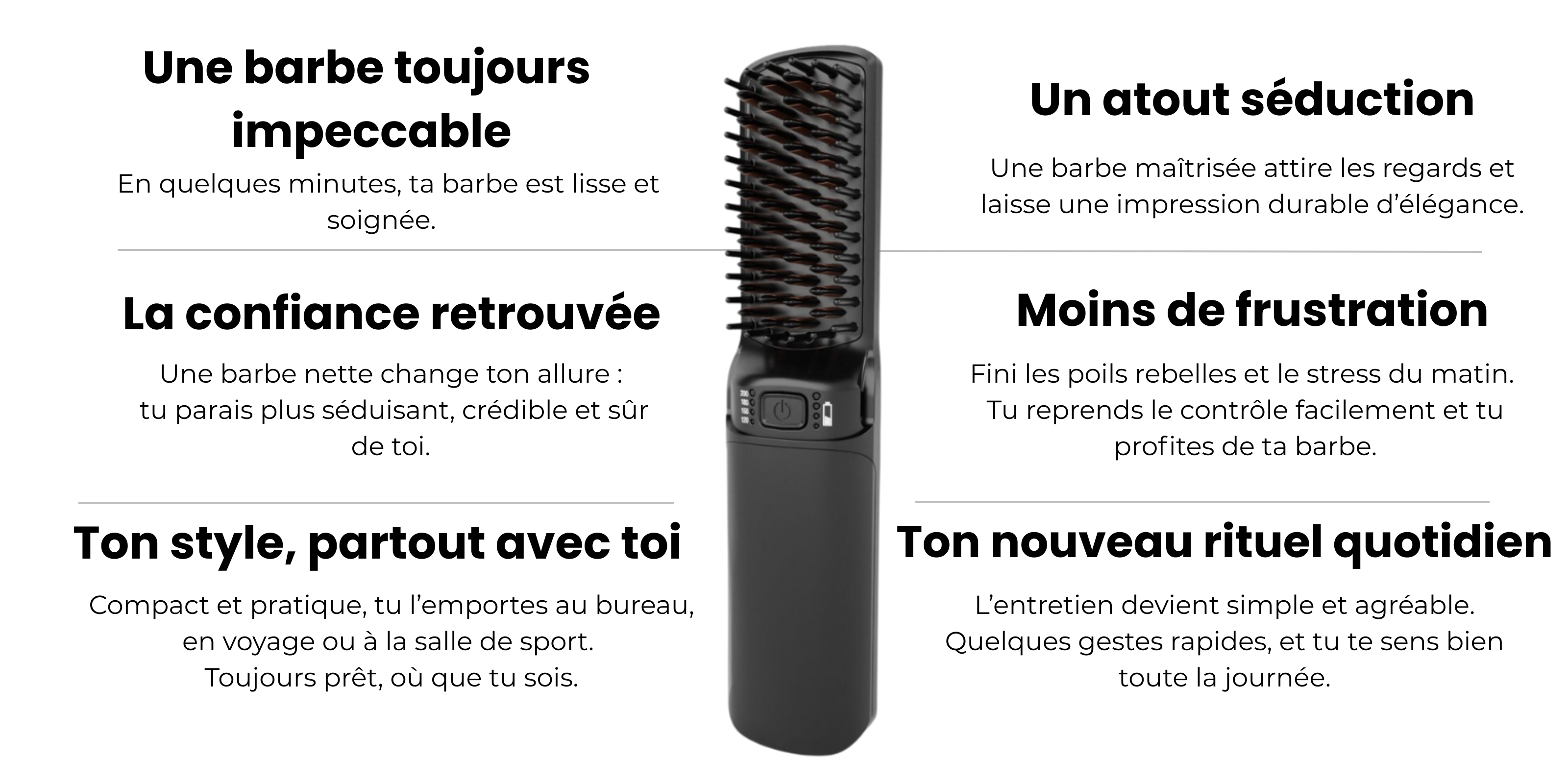 Un peigne aligne temporairement les poils, mais le résultat ne dure pas. BARBÆ ONE, lui, discipline et lisse votre barbe durablement grâce à la chaleur, pour un style impeccable toute la journée.